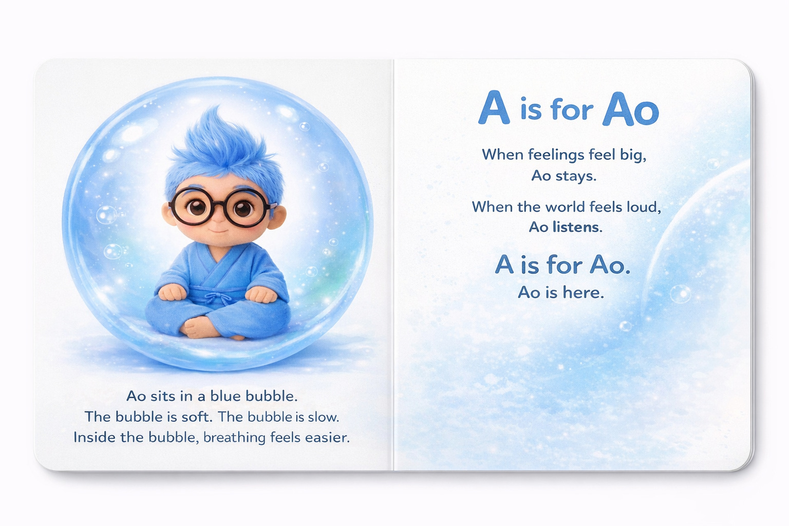 Ao’s name comes from the Japanese word ao (青), a color that traditionally spans blue and green and is associated with calm, clarity, and attunement rather than brightness or force. Ao is a caretaker figure designed to support emotional regulation and pausing. He sits inside a moon pearl, a symbol found across East Asian folklore representing calm awareness and reflected light. Ao’s presence is also influenced by Japanese folk traditions of gentle helpers, particularly Jizō (Ojizō-sama), a protector of children and travelers who watches over moments of transition by staying close rather than intervening. Drawing as well from mindfulness practices in Buddhism and from quiet, companion-centered storytelling traditions, Ao helps children slow down, notice their bodies, and wait for strong feelings to pass. He models an essential social-emotional skill: regulation through presence, reminding children and caregivers that safety and understanding begin with being held, not hurried.