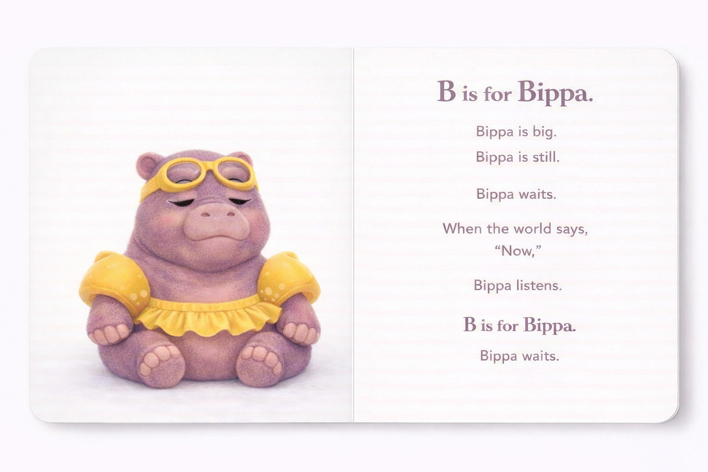 Bippa the Hippa is a character about waiting without shame. Hippos are powerful, grounded animals that spend much of their lives still—resting, floating, watching—moving only when the moment is right. Bippa reflects this natural rhythm. She is big, steady, and unhurried.
