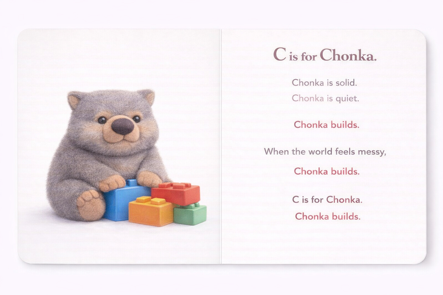 Chonka the Wombat is a character about building calm through structure.